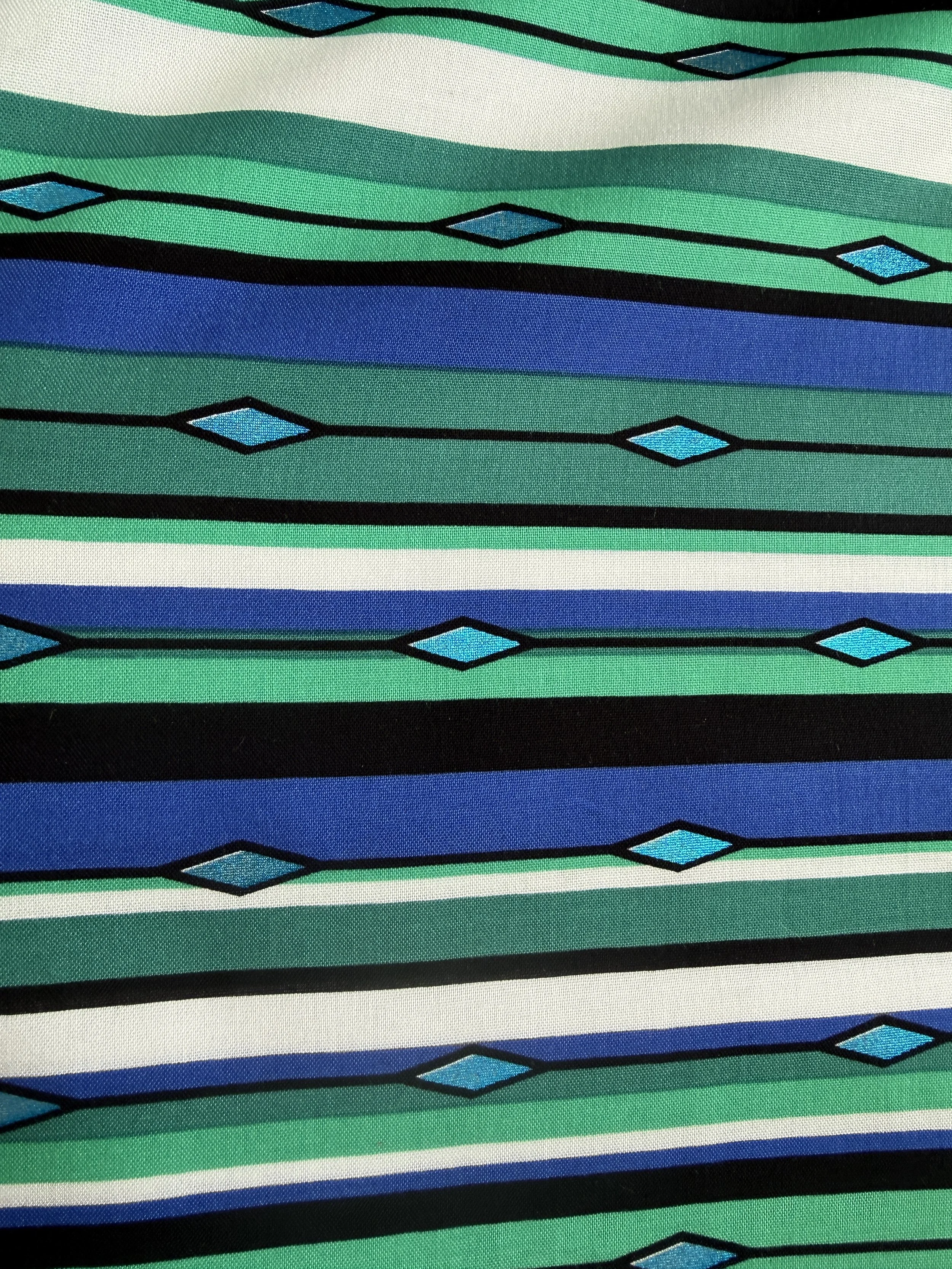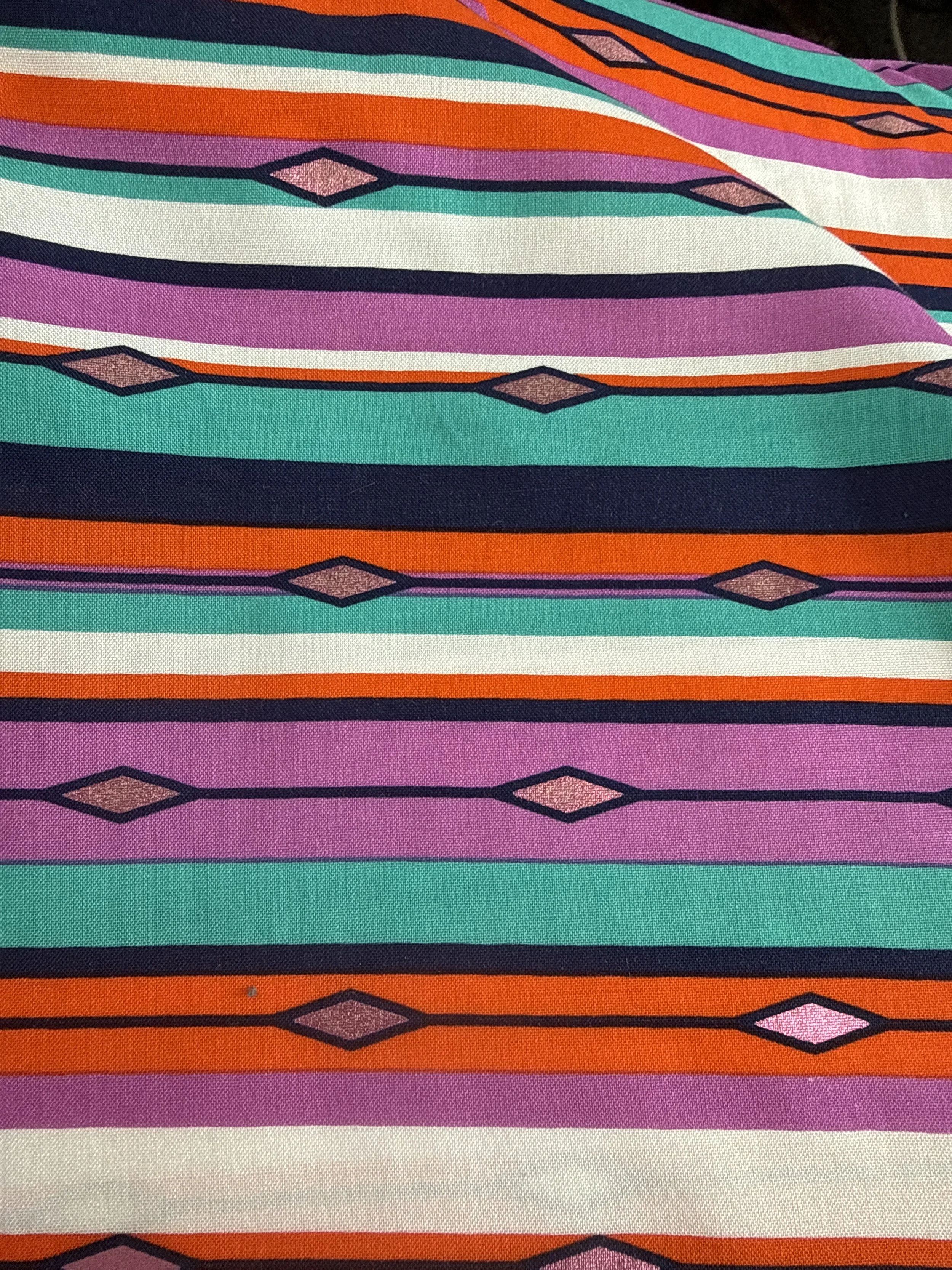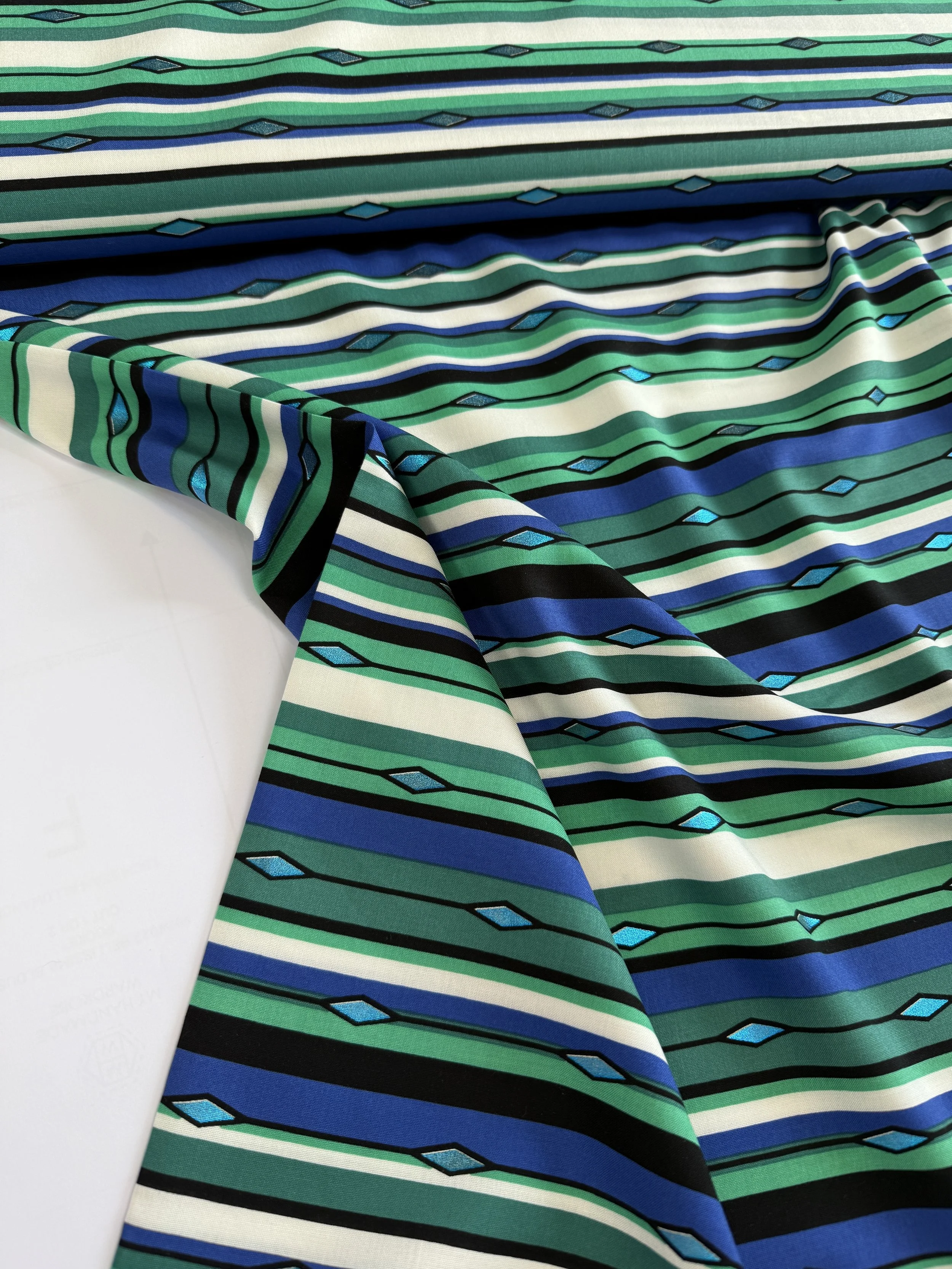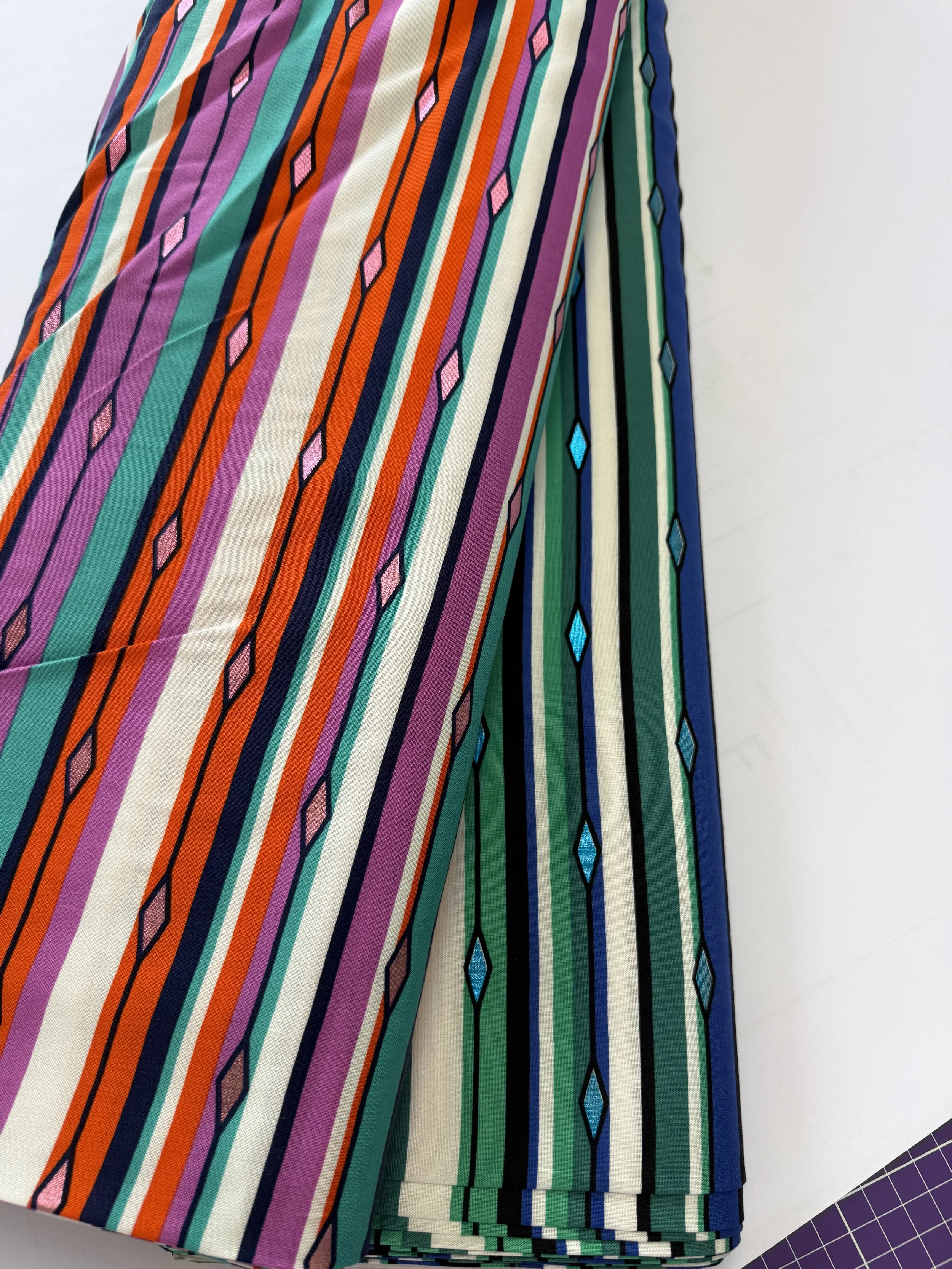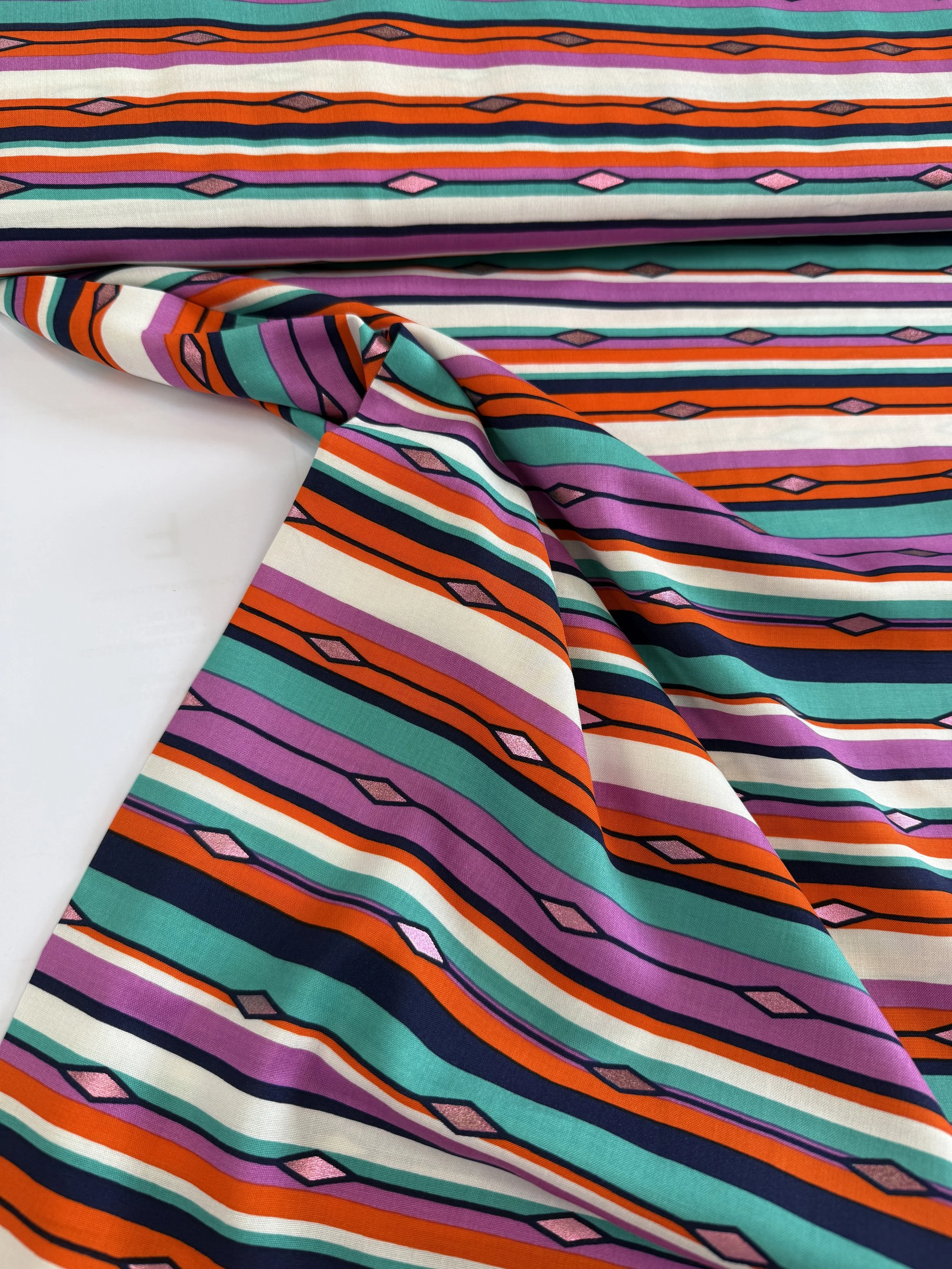 A beautiful viscose challis fabric featuring eye-catching metallic foil detailing. It has a soft, fluid drape, making it perfect for lightweight summer pieces like blouses, dresses, and kaftans. The striped design also offers plenty of creative possibilities when it comes to pattern cutting.